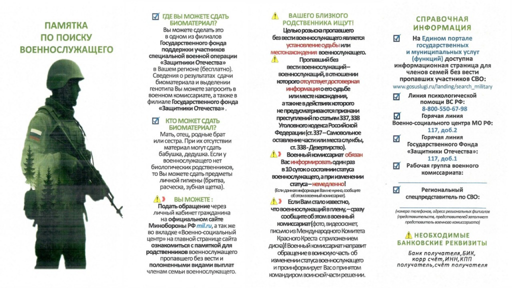 В целях повышения эффективности работы, направленной на розыск пропавших без вести военнослужащих и установление их личности в случаи гибели Министерством обороны Российской Федерации разработана «Памятка по поиску военнослужащего».